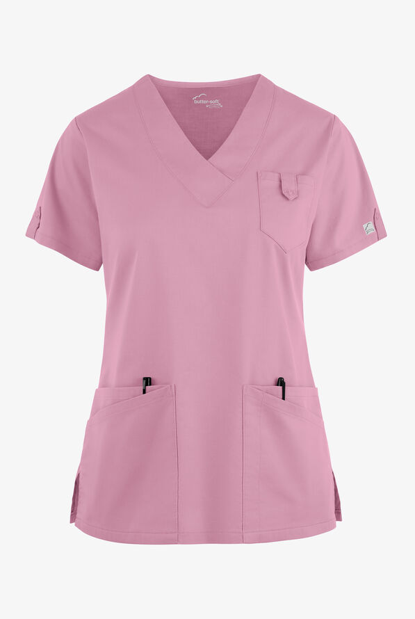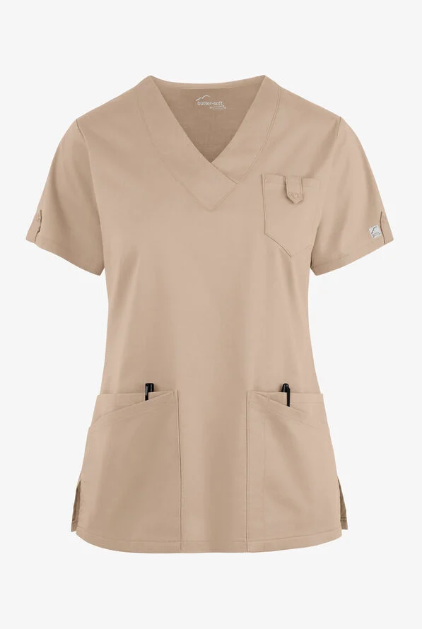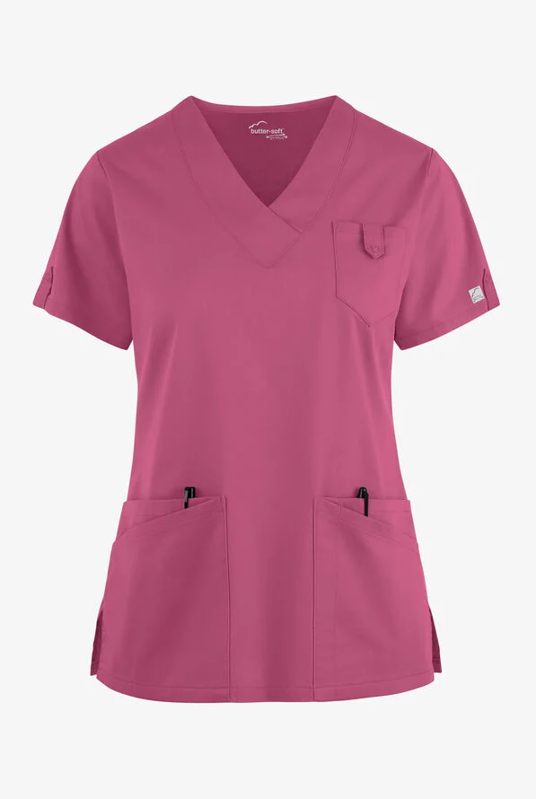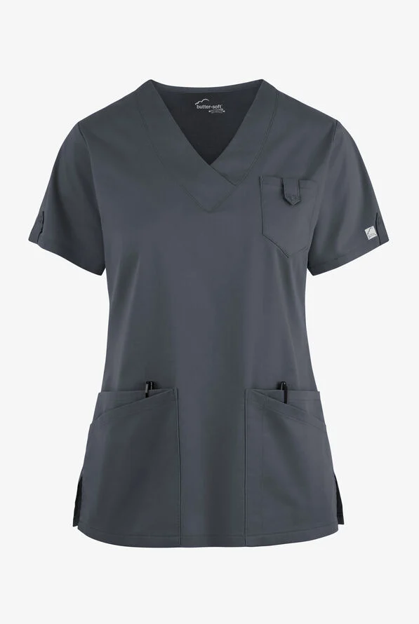 Snap closure tabs on pockets and sleeves give our womenโs scrub top a little something extra. Classic v-neck goes just low enough, and the fit gets accolades from customers time and again. Each piece in our Butter-soft Stretch scrub collection was designed for 12+ hour shifts, and made from easy-care, 2-way stretch comfort fabric.